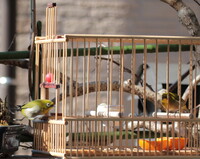 餌付けの必要があまりない、とも言えますが。 ということで、自然界にエサが少ない冬こそが 餌付けのシーズンなのです。あーあ。 餌付けしたいなあ。 せっかくメジロに名前つけたのに。 「メジ」って。 ()メジロを飼うのが禁止されているのはなぜ? メジロの飼育が禁止されているのは、 鳥獣保護法 によるものが理由です。 国に無許可で乱獲され、高値で売買されることが多く発生したため、省が「原則として飼育を許可しない」と法改正したのがキッカケとなりました。メジロ御殿 タケヒゴの間隔~22ミリの バードフィーダー 餌の補充は御殿を持ち上げて行う。 写真の餌は手製バードケーキ。 気の毒だが、ヒヨドリは入れない。 スズメも眺めるだけ メジロ御殿はメジロ専用である バードフィーダー 2階建て式の御殿